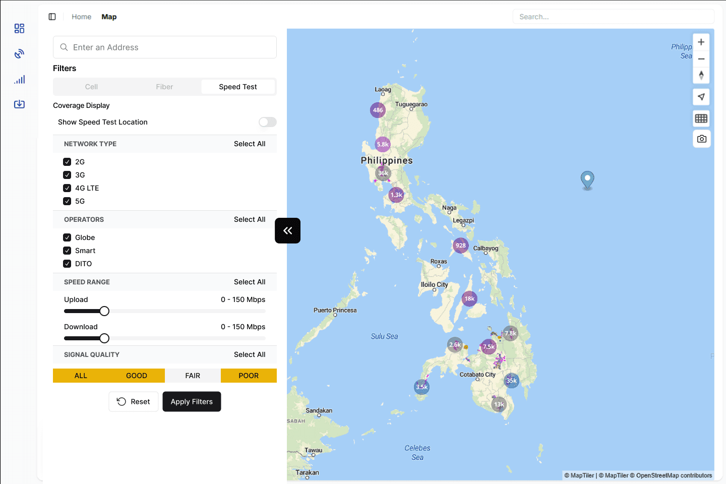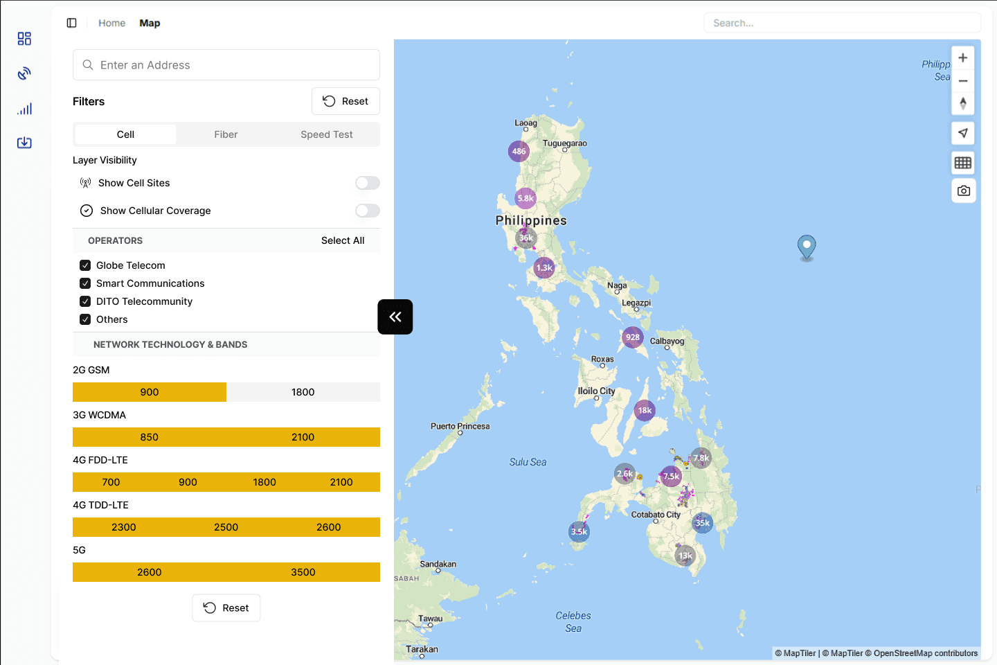 The original interface had poor usability, with tiny map icons and cluttered visuals that made filters hard to find and coverage data difficult to read.