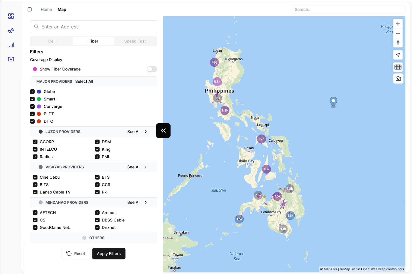 Three detailed filters: Cellular, Fiber, Speed Test, specific to providers.